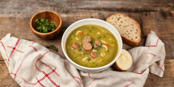 - Mettenden in Scheiben schneiden und mit Senf, Majoran, Salz und Pfeffer zur Suppe geben. Nochmals ca. 5 Minuten ziehen lassen und abschmecken.